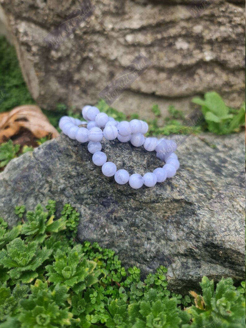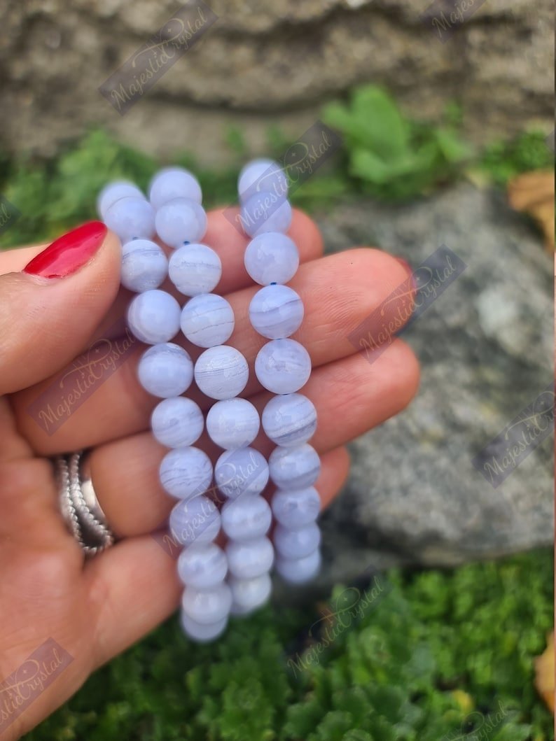 nBlue Lace Agate helps strengthen and accelerate the repair of bones, thyroid deficiencies, throat and lymph infections. It soothes red, sore eyes and any skin problems associated with redness and irritation.